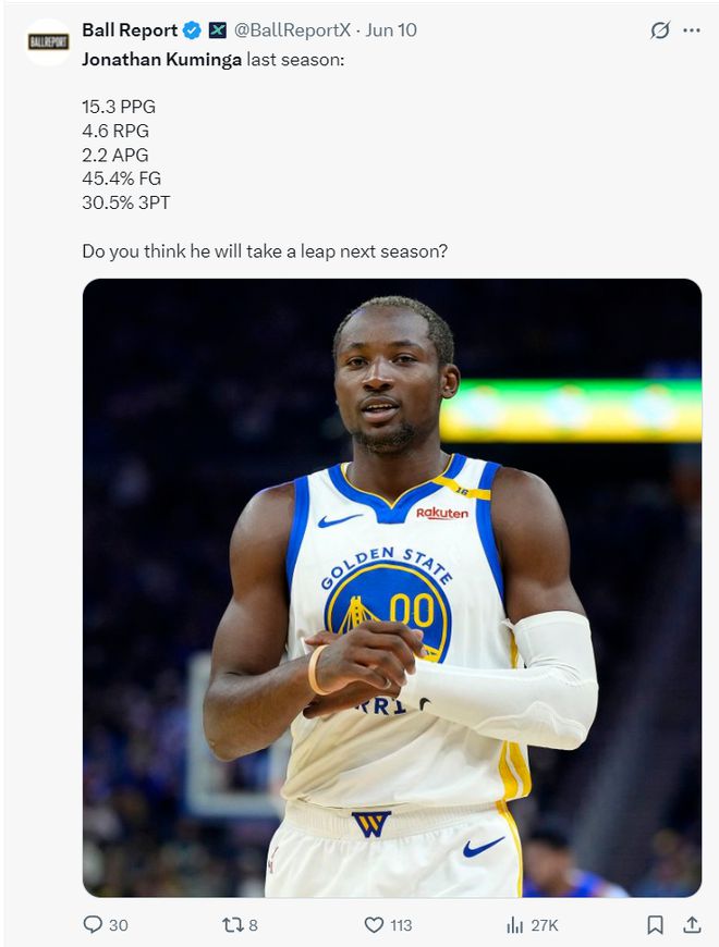 更惨烈的是美媒FW认为勇士队今夏还是应该交易引援,而打包交易的第一筹码就是乔纳森-库明加,库明加先签后换后是一个最佳筹码。