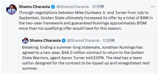 从7月到9月,小迈克-邓利维与特纳持续谈判,最终勇士队在两年合同框架内将报价总额提高了800万美元,且本赛季为库明加提供的保障金额,比其资质报价高出约1500万美元。