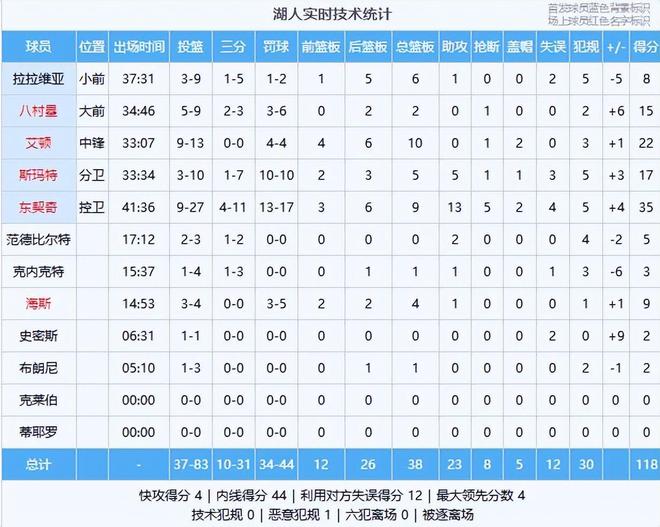湖人数据(主队):东契奇35分9板13助5断2帽、艾顿22分10板2帽、斯玛特17分5板5助、八村塁15分2板、海斯9分4板1助、拉拉维亚8分6板1助、范德比尔特5分2助、克内克特3分1板1助、布朗尼2分1板、史密斯2分