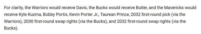 独行侠得到:库兹马+波蒂斯+小波特+普林斯+32年勇士首轮+30年雄鹿首轮互换+32年雄鹿首轮互换。